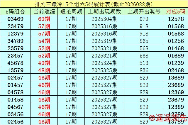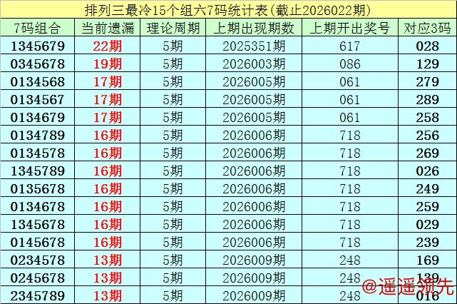 (1)在排列三已开出的7497期奖号中(统计截止第2026022期),目前7码组六遗漏值最大的组合为:1345679,本期遗漏22期;