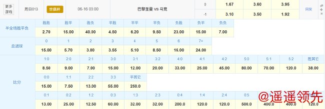 竞彩官方给世俱杯B组焦点战开出了1.67(大巴黎胜) 3.60(平局) 3.95(马竞胜)的赔率组合,大巴黎明显人气占优!与此同时开出了比分赔率,其中大巴黎2-1取胜最低,目前为1赔7,其次是1-1的平局,赔率为1赔7.5;大巴黎1-0和2-0赢球分别为1赔8.5和1赔9紧随其后。马竞方面,赢球的最低赔为2-1的1赔12.5。总体来看,大巴黎数据占据上风,世俱杯死亡之组首秀,大巴黎或凭借华丽的进攻拿下马竞这块硬骨头!